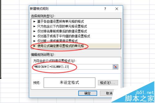 4、我们选择最后一个规则,使用公式确定要设置格式的单元格。并输入公式:=MOD(ROW()+COLUMN(),2)