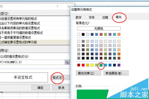 5、设置好公式后,需要对符合公式的单元格设置格式,单击格式按钮。在设置单元格格式窗口中,打开最后一个页签,填充,这里我选择了绿色。