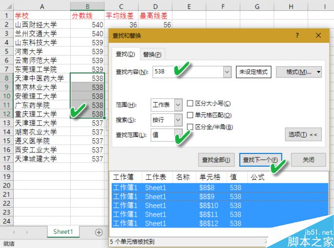 用Ctrl+F查找,按指定范围,指定值进行精准定位。在查找的结果中用Ctrl+A全选后,表中所有符合条件的单元格即被自动全部选中。