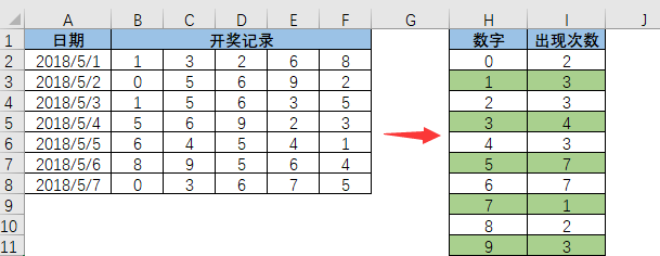 =COUNTIF(OFFSET($B$2,,,COUNT(B:B),5),H2),确定,可得数字0出现的次数,公式向下填充,可得所有数字出现的次数。