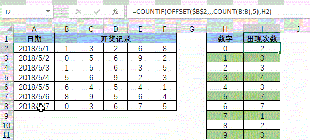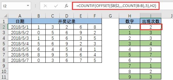 COUNTIF+OFFSET:统计动态区域内数字出现的个数