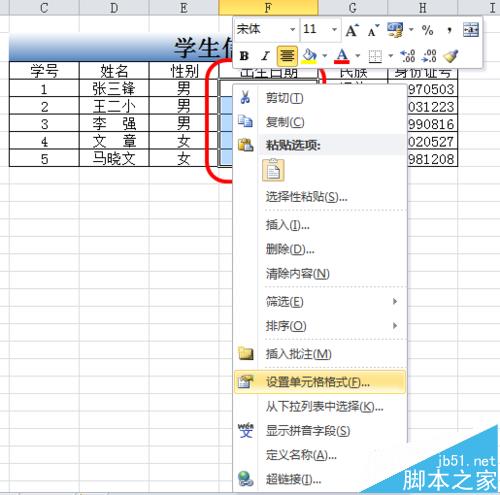 5、然后鼠标指向已选中的日期单元格,单击鼠标右键-〉“设置单元格格式”: