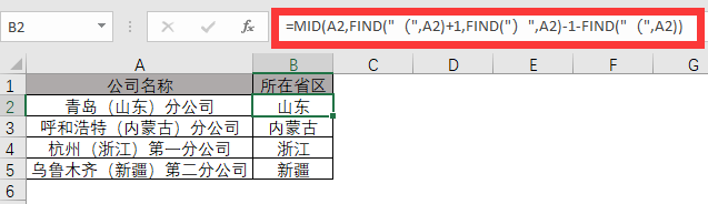 =MID(A2,FIND(“(”,A2)+1,FIND(“)”,A2)-1-FIND(“(”,A2)),确认以后,即可取出A2单元格括号内的省区“山东”。公式向下填充,即可得A列所有单元格括号内省区。