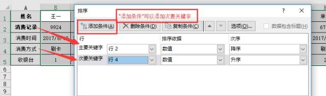 次要关键字选择消费方式所在的“行4”,根据要求选择升序或者降序;