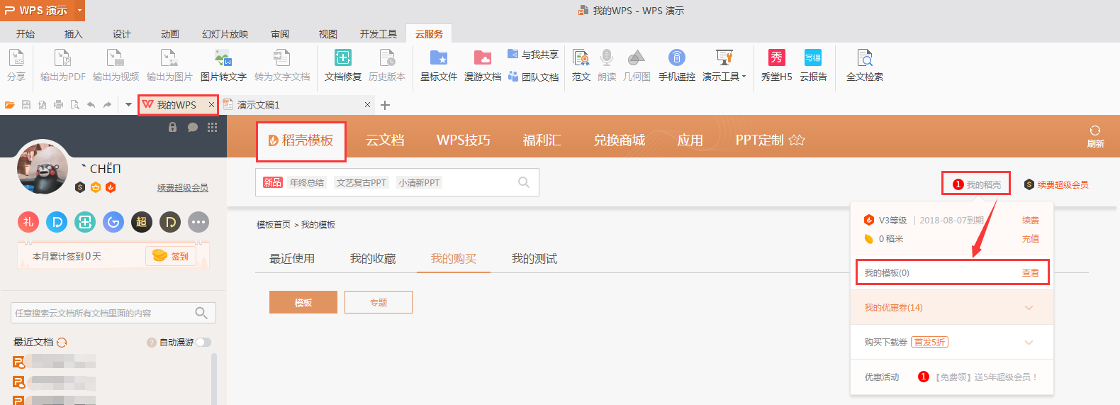 点击打开“我的WPS”界面---“稻壳模板”,点击右上角”我的稻壳“--”我的模板“,在这里即可进行查看