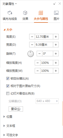 选取要改变尺寸的图片。单击鼠标右键,在右键菜单中选取“设置对象格式”,打开右侧对象属性窗格。在对象属性窗格上,单击“大小与属性”,在“大小”下,键入所需的高度及宽度。 提示 若要还原图片大小,可单击“...