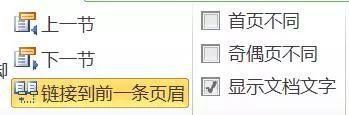 要掌握各节中如何设置不同的页眉(页脚),就得掌握“链接到前一条页眉”、“首页不同”、“奇偶页不同”三个按钮的作用。