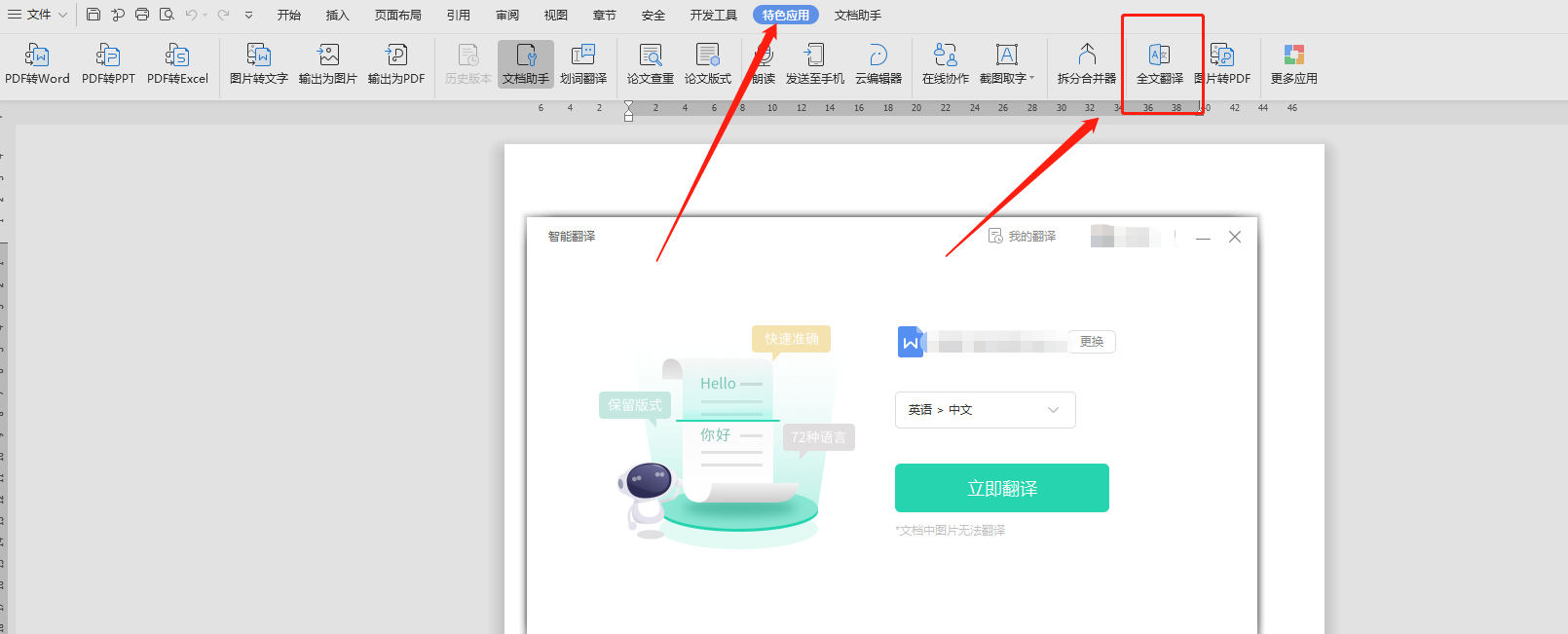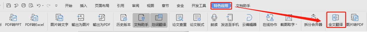 以WPS 2019版为例 第一种:全文翻译 1. 打开文档,依次点击“特色应用”—“全文翻译” 2. 在弹出框根据需求进行选择,点击开始翻译即可 第二种:划词翻译 打开文档,依次点击“特色应用”—“划...
