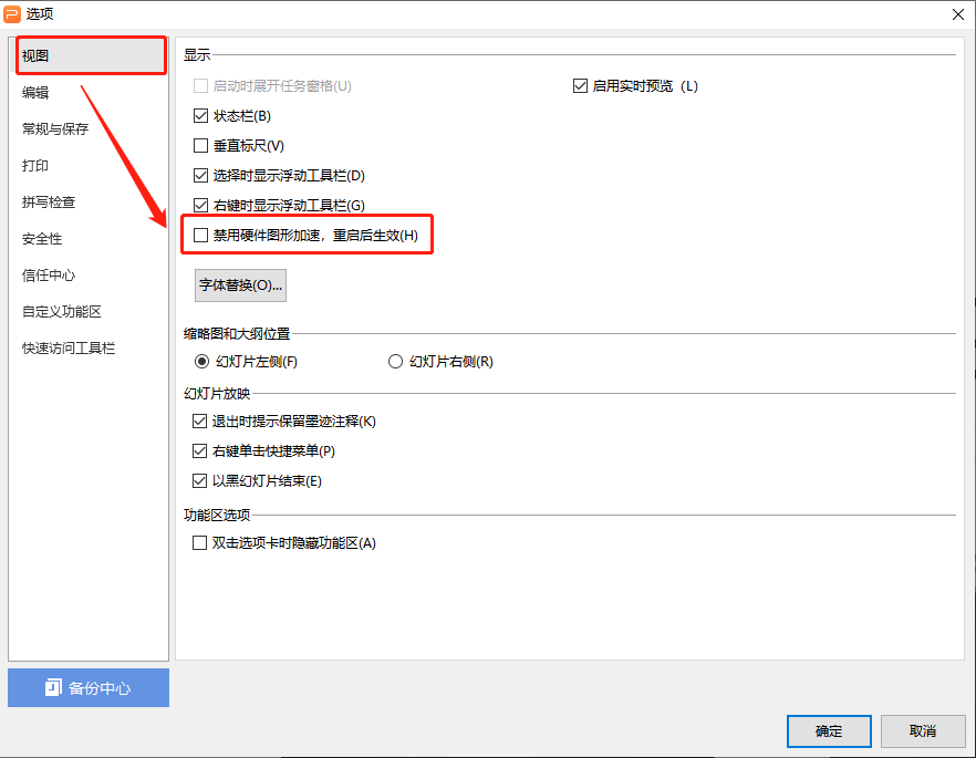 注:若没有该功能,可依次点击“文件”—“选项”—“视图”,取消勾选“禁用硬件图形加速,重启后生效”,重启后再进行尝试。