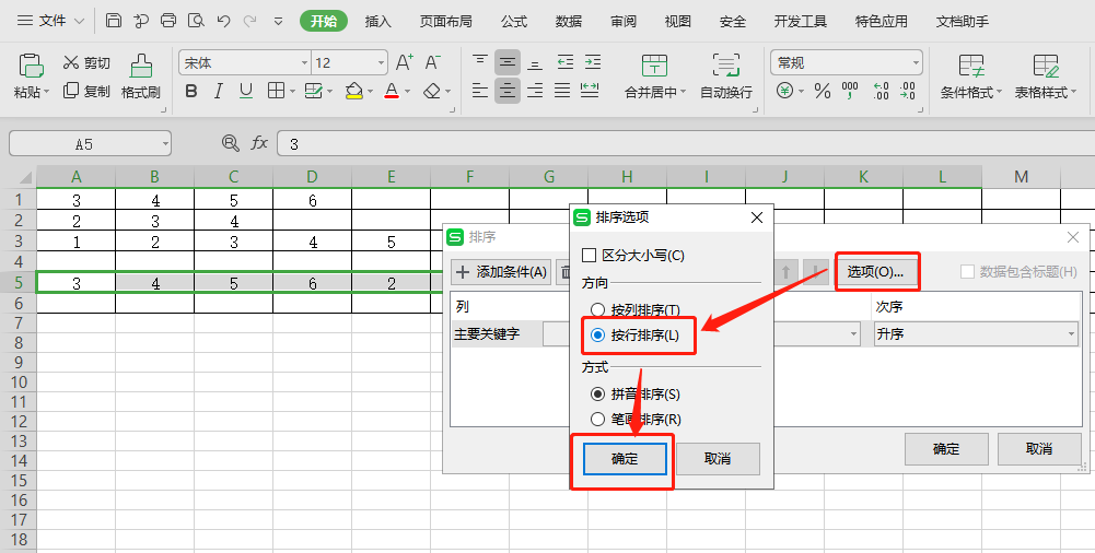 以WPS 2019版为例 1. 打开表格,将内容复制到同一行; 2.依次点击“开始”—“排序”—“自定义排序”; 3.依次点击“选项”—“按行排序”—“确定”; 4.对排序进行相关设置后,点击“确定”...