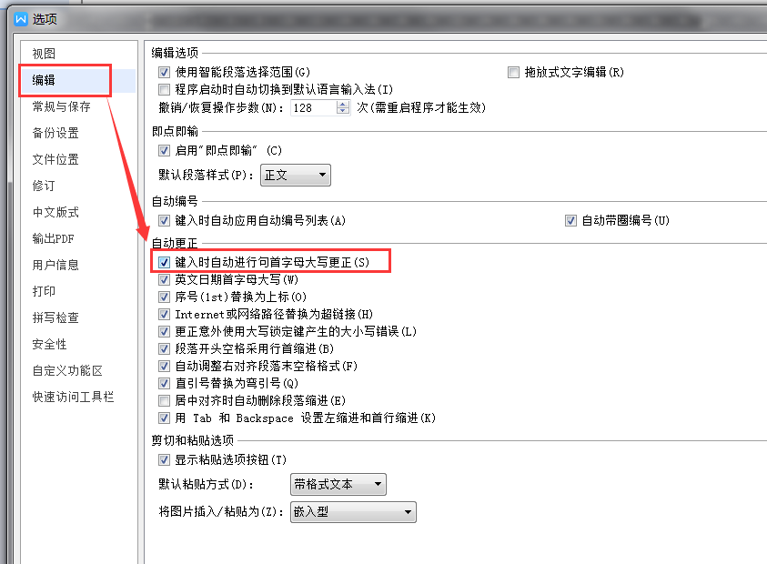 点击左上角“wps文字”--“选项”,弹出对话框,点击”编辑“--”键入时自动进行句首字母大写更正“即可...