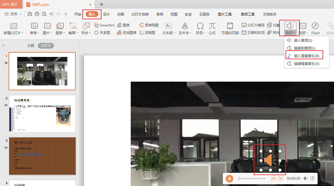 可以按照以下步骤设置一下: 1.打开您的ppt的第一页,在最上方的功能区点击“插入”-“音频”-选择“嵌入背景音乐” 2.会发现页面中出现一个“小喇叭”(如图),选中这个“小喇叭”功能区会出现“音频工...