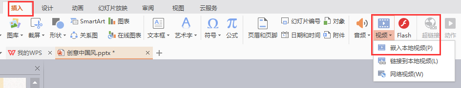 先点击功能区“插入 - 视频-嵌入本地视频”...