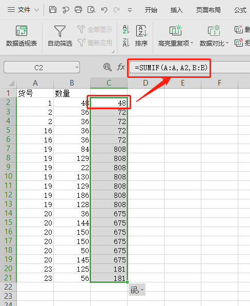 如何从A栏的货号相同合并,将B栏的数量相加?如图: