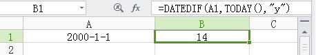 WPS 表格中的DATEDIF() 函数可以计算两个日期之间的天数、月数或年数。 例如A1是出生日期,在任意单元格中输入公式=DATEDIF(A1,TODAY(),"y"),回车即可查看结果。...