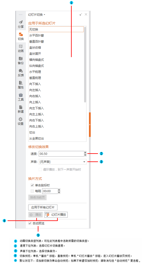 幻灯片切换 通过幻灯片切换任务窗格(任务窗格:是应用程序中提供常用的窗口。其位置、大小均可根据实际需要调整,方便用户在使用相关时仍可继续编辑文稿。),可以为幻灯片添加切换效果(包括动画切换类型、切换速...