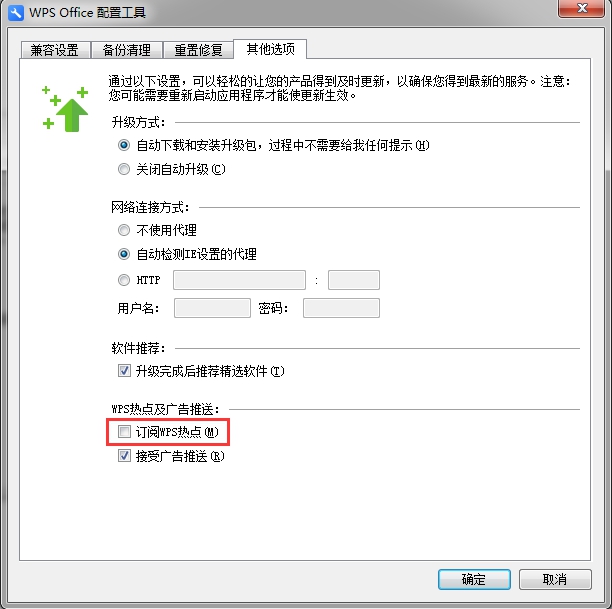 点击“系统左下角的开始-所有程序-WPS office-WPS offic工具-配置工具-高级-其他选项”,将订阅WPS热点的勾选取消。...