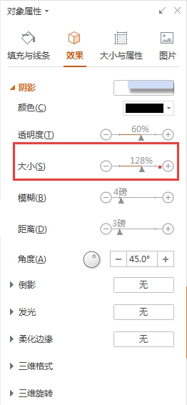 双击图片,在右侧的窗格内设置对象属性,在效果下设置阴影的大小。...